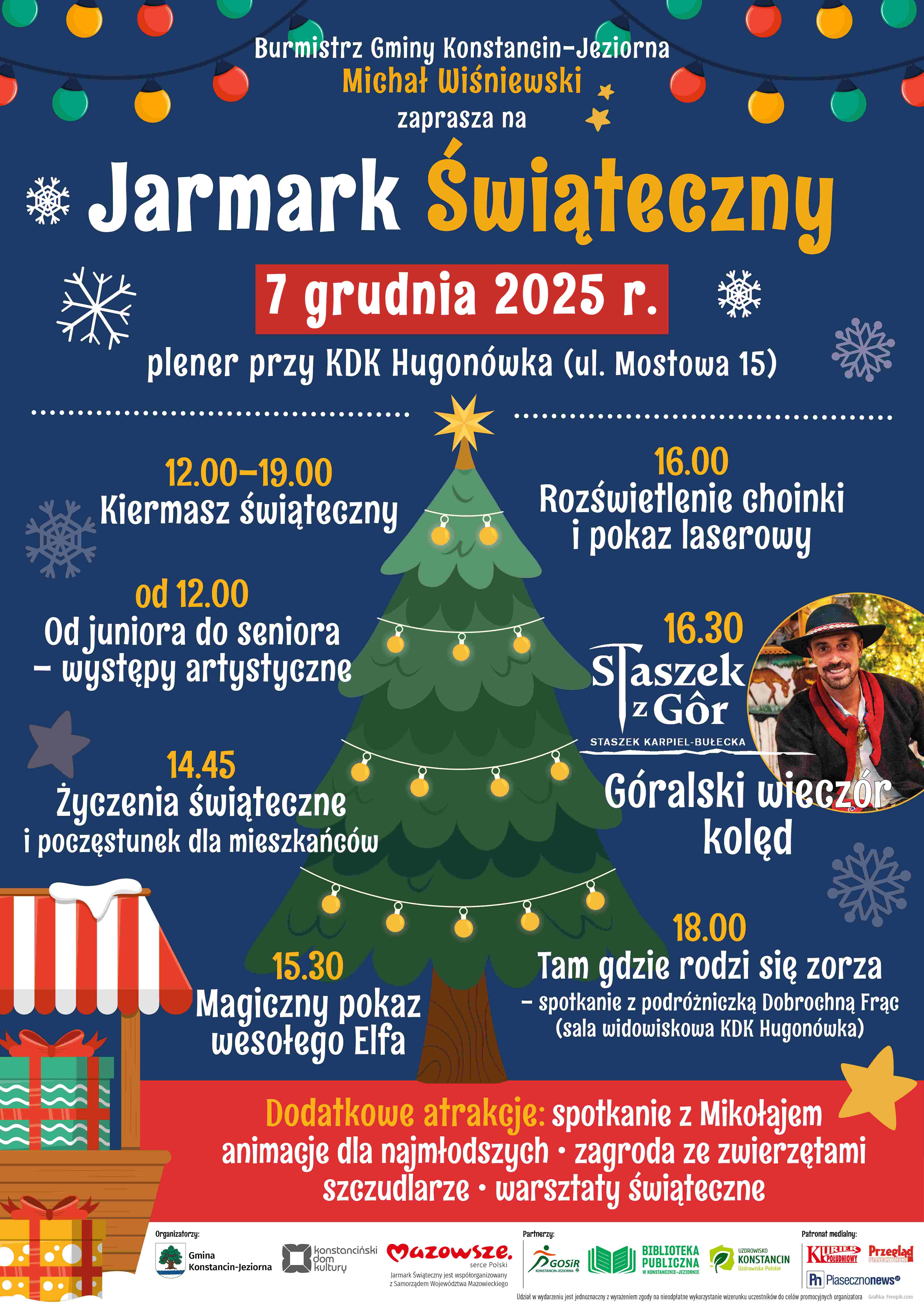 Do wspólnego świętowania i kolędowania zaprasza Michał Wiśniewski, burmistrz gminy Konstancin-Jeziorna. Organizatorem Jarmarku Świątecznego była gmina Konstancin-Jeziorna (Wydział Promocji i Współpracy Zagranicznej). Współorganizatorem – Konstanciński Dom Kultury, a partnerami: Gminny Ośrodek Sportu i Rekreacji, Biblioteka Publiczna, Uzdrowisko Konstancin-Zdrój, Nadleśnictwo Chojnów (sponsor choinek) oraz OSP Konstancin-Jeziorna. Jarmark Świąteczny jest współorganizowany z Samorządem Województwa Mazowieckiego. Patronat medialny objęli: „Kurier Południowy”, „Przegląd Piaseczyński” oraz portal informacyjny piasecznonews.pl.