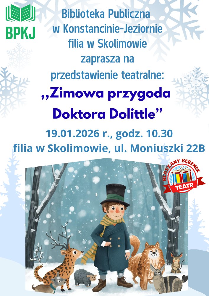 19 stycznia 2026 r. o godz. 10.30 w Bibliotece Publicznej, filia w Skolimowie odbędzie się przedstawienie teatralne dla dzieci pt. „Zimowa przygoda Doktora Dolittle”.
