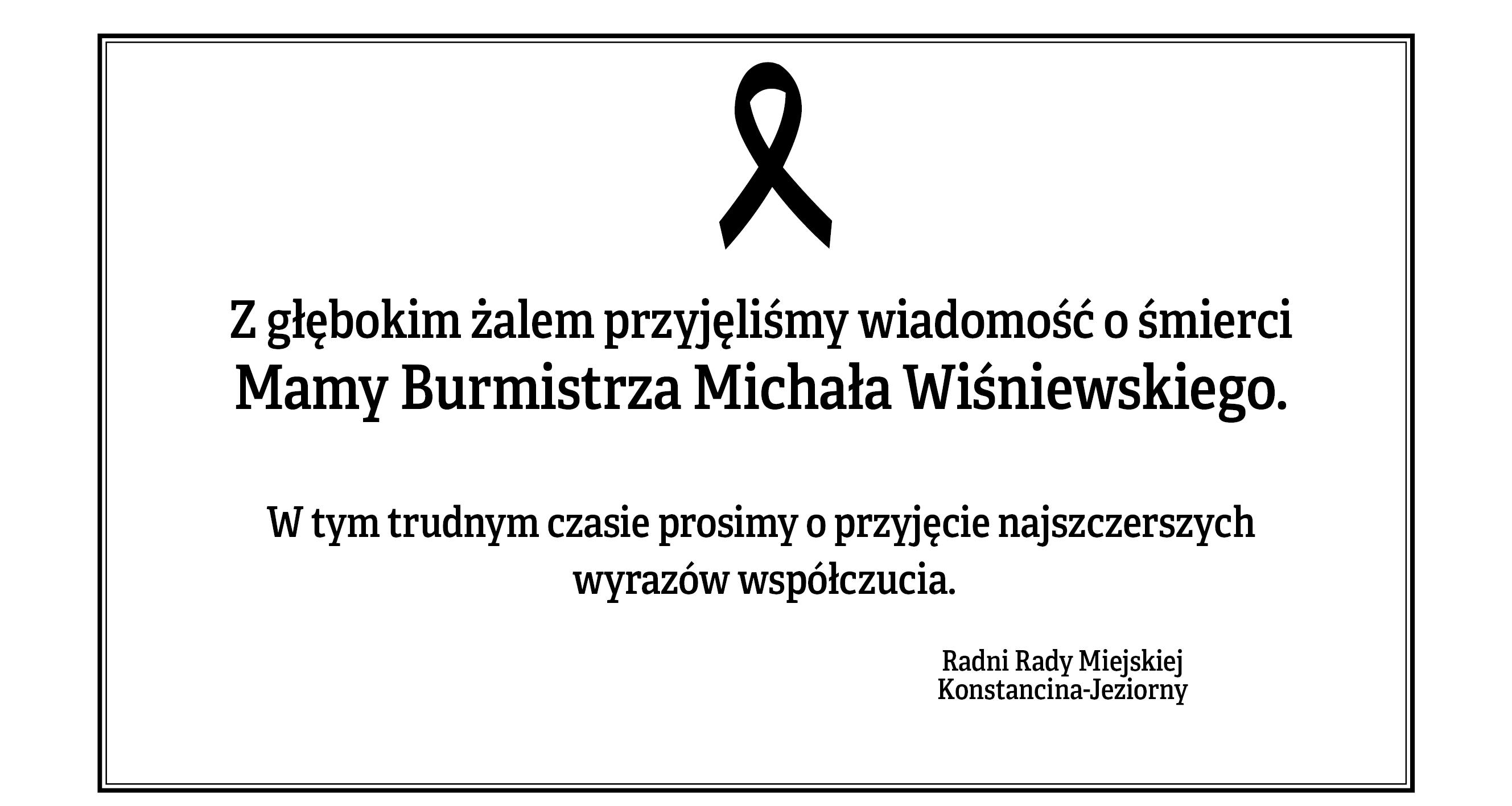 Michałowi Wiśniewskiemu, Burmistrzowi Gminy Konstancin-Jeziorna, oraz Jego Rodzinie i Bliskim w tym trudnym czasie wyrazy współczucia, z powodu śmierci Mamy składają Radni Rady Miejskiej Konstancina-Jeziorny.