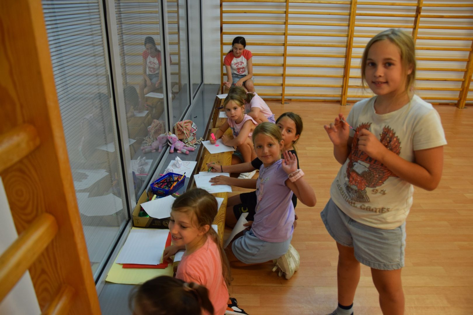 • Zdjęcie grupy uśmiechniętych dzieci rysujących w sali gimnastycznej.