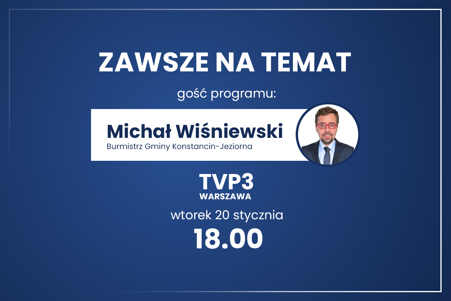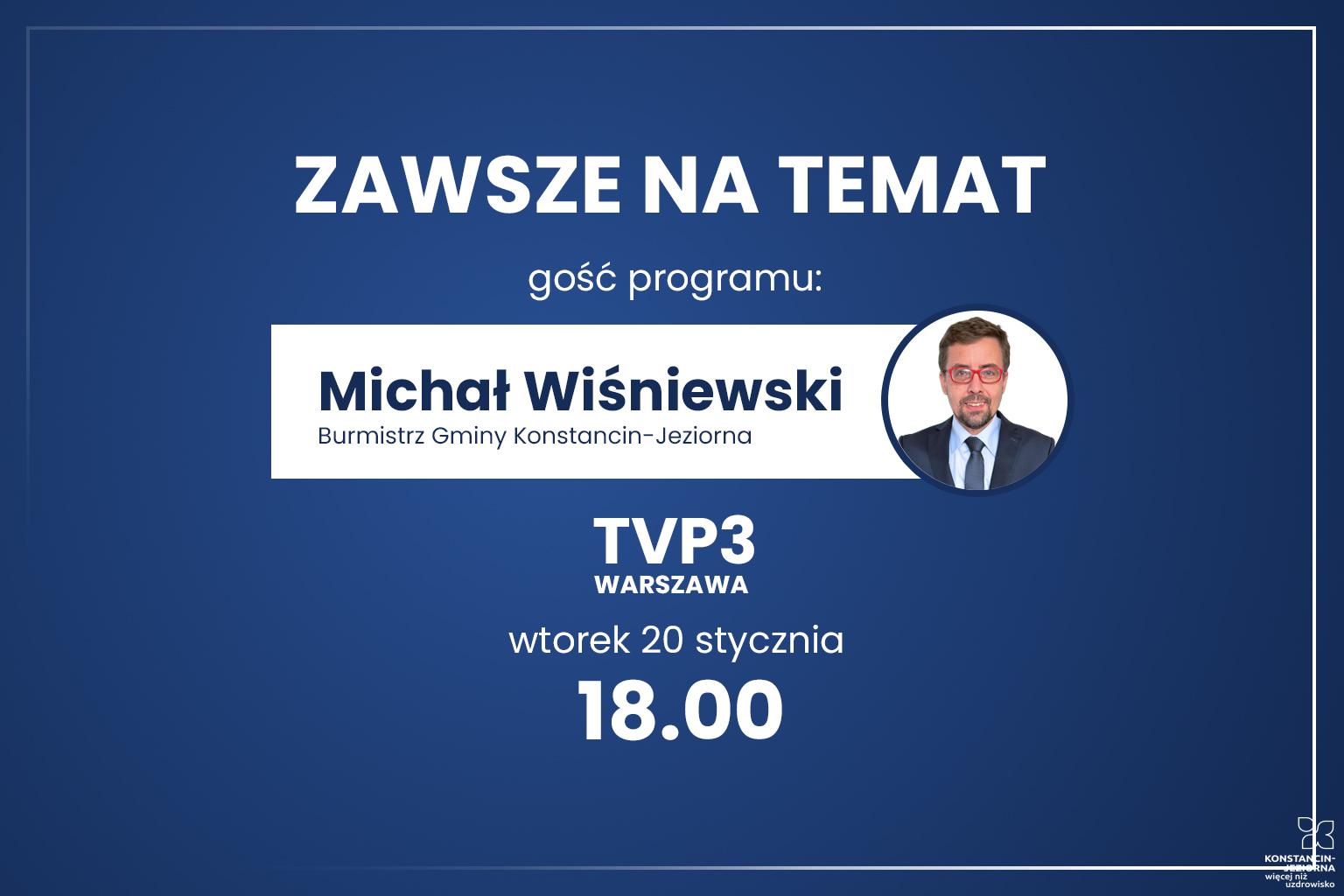Michał Wiśniewski, burmistrz Konstancina-Jeziorny, we wtorek (20 stycznia) będzie gościem programu „Zawsze na Temat” w TVP3 Warszawa. Włodarz opowie m.in. o najważniejszych gminnych inwestycjach zaplanowanych na 2026 r. oraz odniesie się do aktualnej sytuacji na lokalnej scenie politycznej. Początek programu o godz. 18.00.