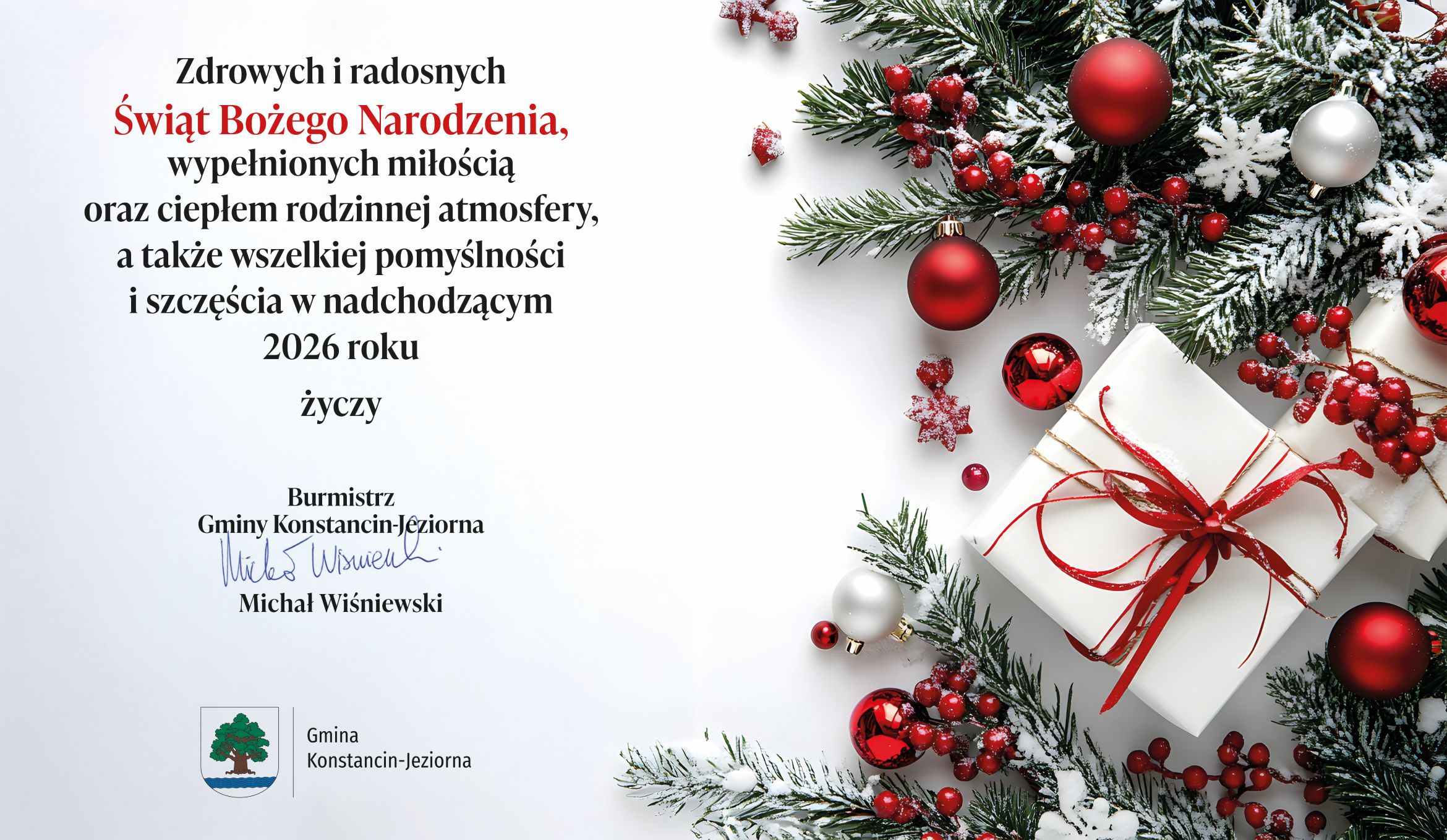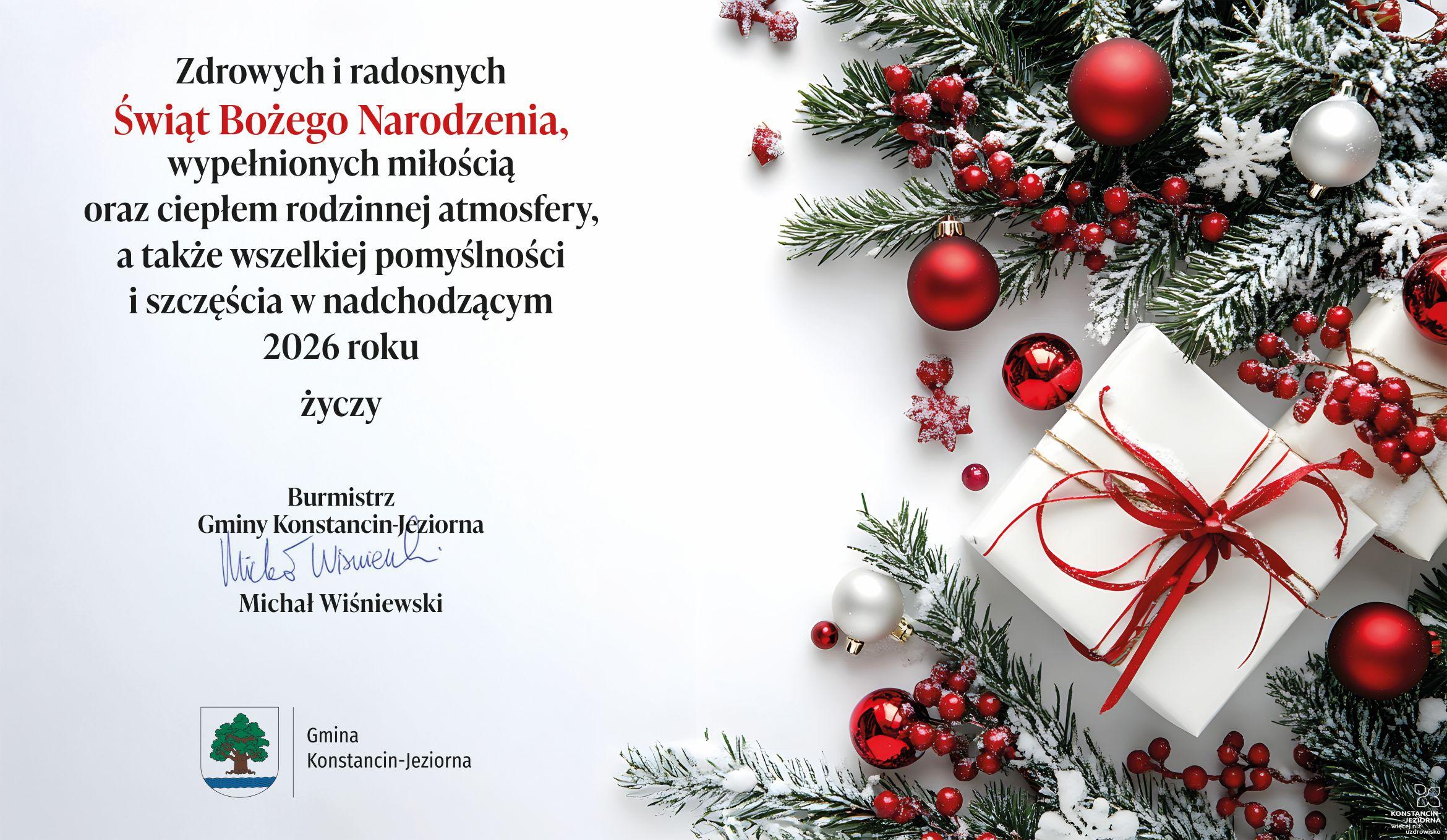 Boże Narodzenie to czas spokoju, rodzinnych spotkań i radości. Z tej wyjątkowej okazji oraz zbliżającego się nowego 2026 roku Michał Wiśniewski – burmistrz gminy Konstancin-Jeziorna składa najserdeczniejsze życzenia.