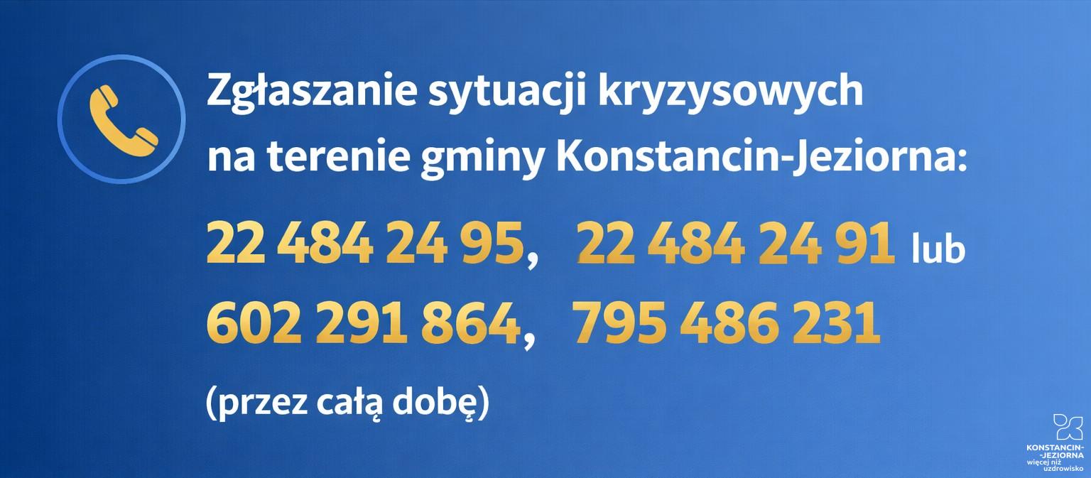 Sytuacje kryzysowe na terenie gminy Konstancin-Jeziorna można zgłaszać telefonicznie przez całą dobę. Dyżur pełniony jest nieprzerwanie, siedem dni w tygodniu.