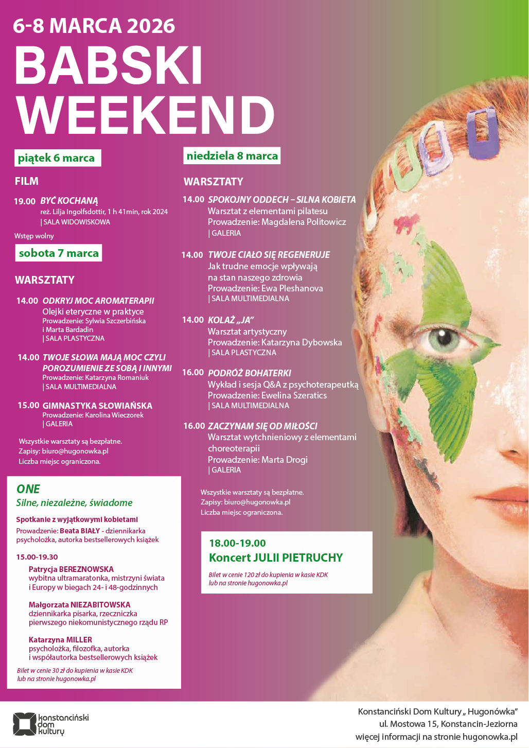 Czas uczcić Dzień Kobiet w Konstancinie-Jeziornie. Z tej okazji Konstanciński Dom Kultury zaprasza na „Babski Weekend”, który w dniach 6–8 marca zamieni Hugonówkę w centrum kobiecej energii. Trzydniowy program to bogata mozaika bezpłatnych warsztatów z zakresu rozwoju osobistego, aromaterapii i jogi, a także unikalna okazja do spotkań z inspirującymi postaciami w ramach cyklu „ONE” – Patrycją Bereznowską, Katarzyną Miller i Małgorzatą Niezabitowską oraz bezpłatnego seansu norweskiego filmu „Być kochaną”. Wydarzenie zwieńczy nastrojowy, folkowo-popowy recital Julii Pietruchy, który odbędzie się w niedzielny wieczór. Większość zajęć jest bezpłatna, ale obowiązują zapisy.
