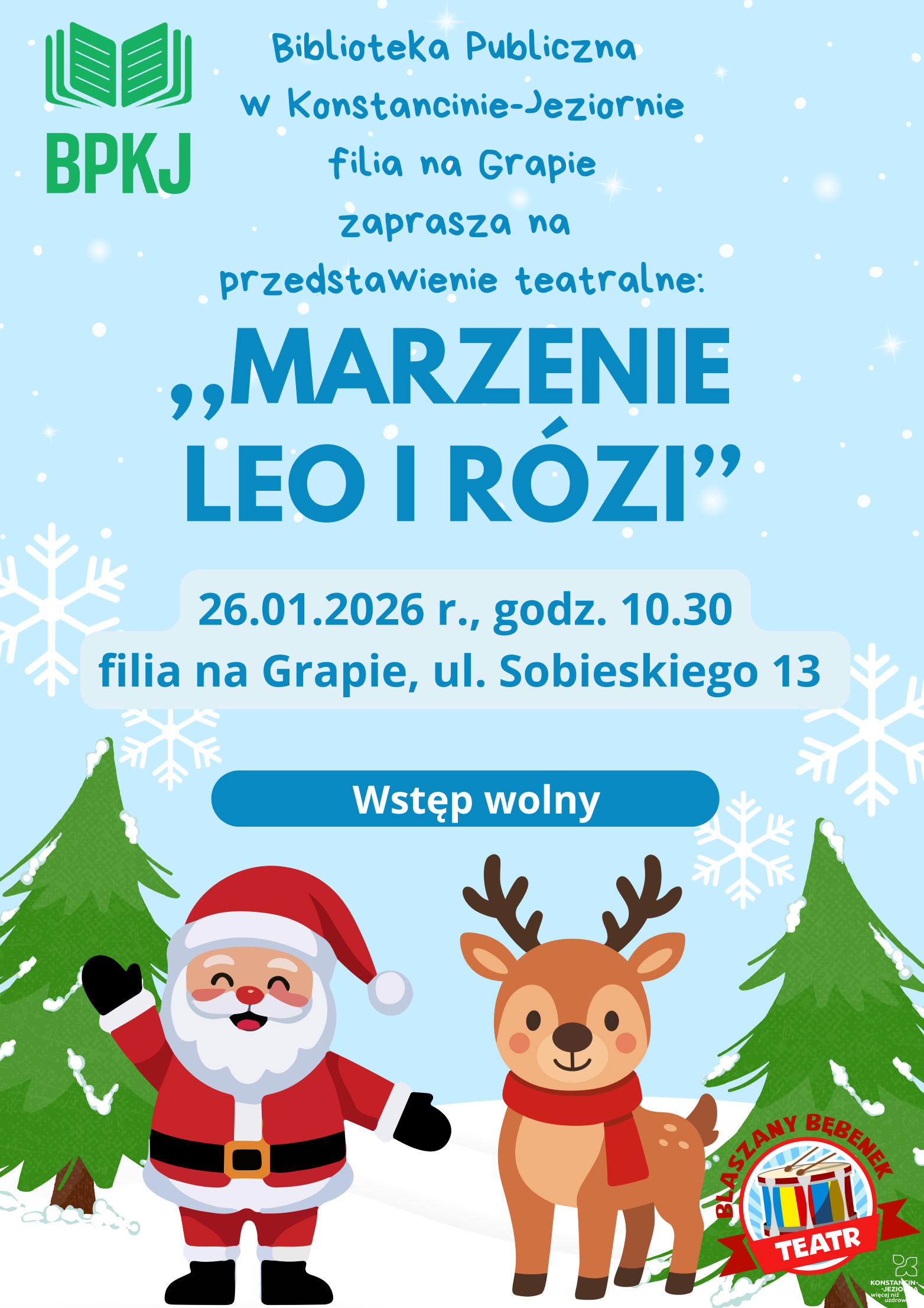 - 26 stycznia (piątek) o godz. 10.30: spektakl dla dzieci „Marzenie Leo i Rózi”