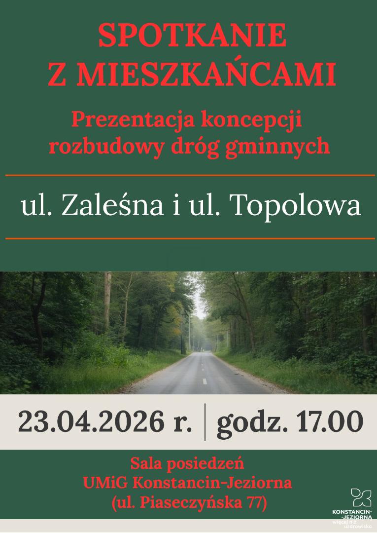 W najbliższy czwartek (23 kwietnia) w Urzędzie Miasta i Gminy Konstancin-Jeziorna odbędzie się spotkanie poświęcone koncepcji rozbudowy ul. Zaleśnej oraz ul. Topolowej w Borowinie. Zapraszamy wszystkich zainteresowanych do udziału. Początek o godz. 17.00.