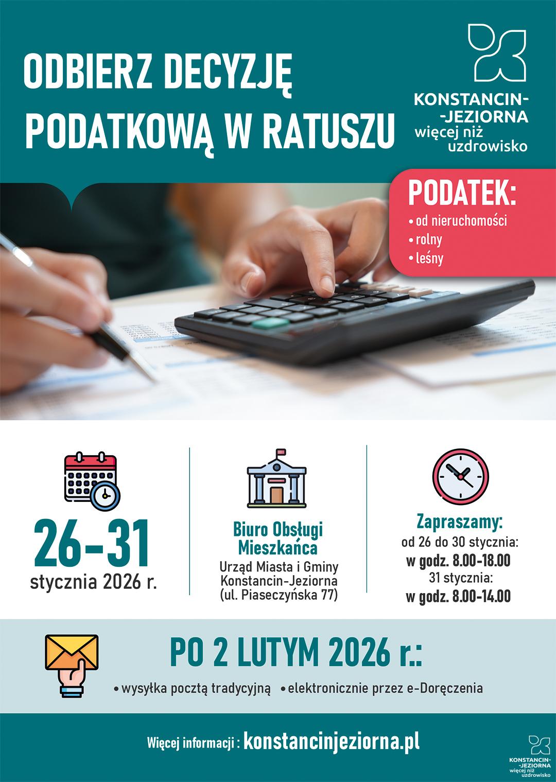 Zbliża się wysyłka decyzji podatkowych na 2026 r. Mieszkańcy, którzy chcą odebrać je wcześniej, mogą zrobić to osobiście w Urzędzie Miasta i Gminy Konstancin-Jeziorna w dniach 26–31 stycznia. W tym czasie magistrat będzie czynny w wydłużonych godzinach, także w sobotę.