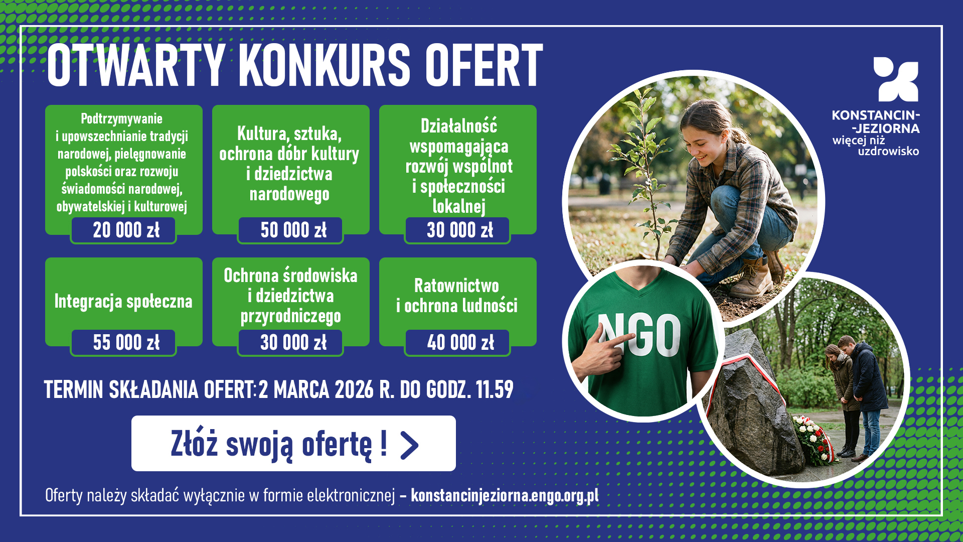 Oferty należy składać wyłącznie w formie elektronicznej – po raz pierwszy za pośrednictwem generatora eNGO, dostępnego na stronie: konstancinjeziorna.engo.org.pl. Termin upływa 2 marca 2026 r. o godz. 11.59.59 (decydują data i godzina wysłania oferty przez generator).