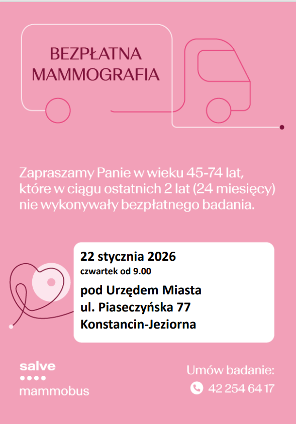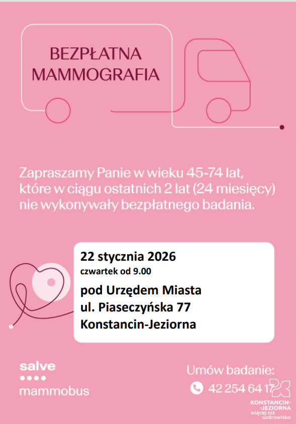 Mieszkanki gminy Konstancin-Jeziorna już 22 stycznia (czwartek) ponownie będą mogły skorzystać z bezpłatnej mammografii. Mobilny mammobus zaparkuje tradycyjnie przed ratuszem. Badanie nie wymaga skierowania lekarskiego, jednak konieczna jest wcześniejsza rejestracja.