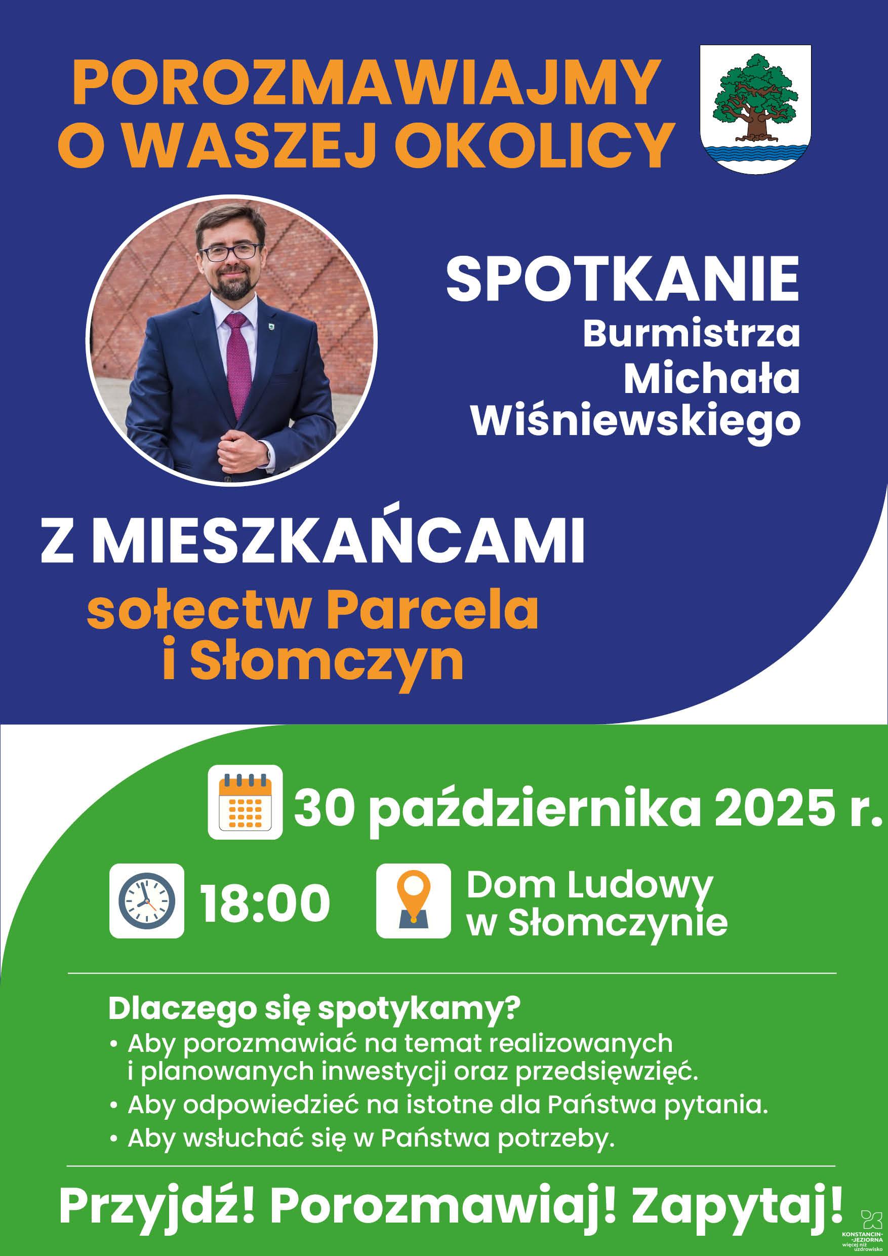 Już w najbliższy czwartek (30 października) w ramach cyklu „Porozmawiajmy o waszej okolicy” burmistrz Michał Wiśniewski spotka się z mieszkańcami sołectw Parcela i Słomczyn w Domu Ludowym w Słomczynie. Początek spotkania o godz. 18.00.