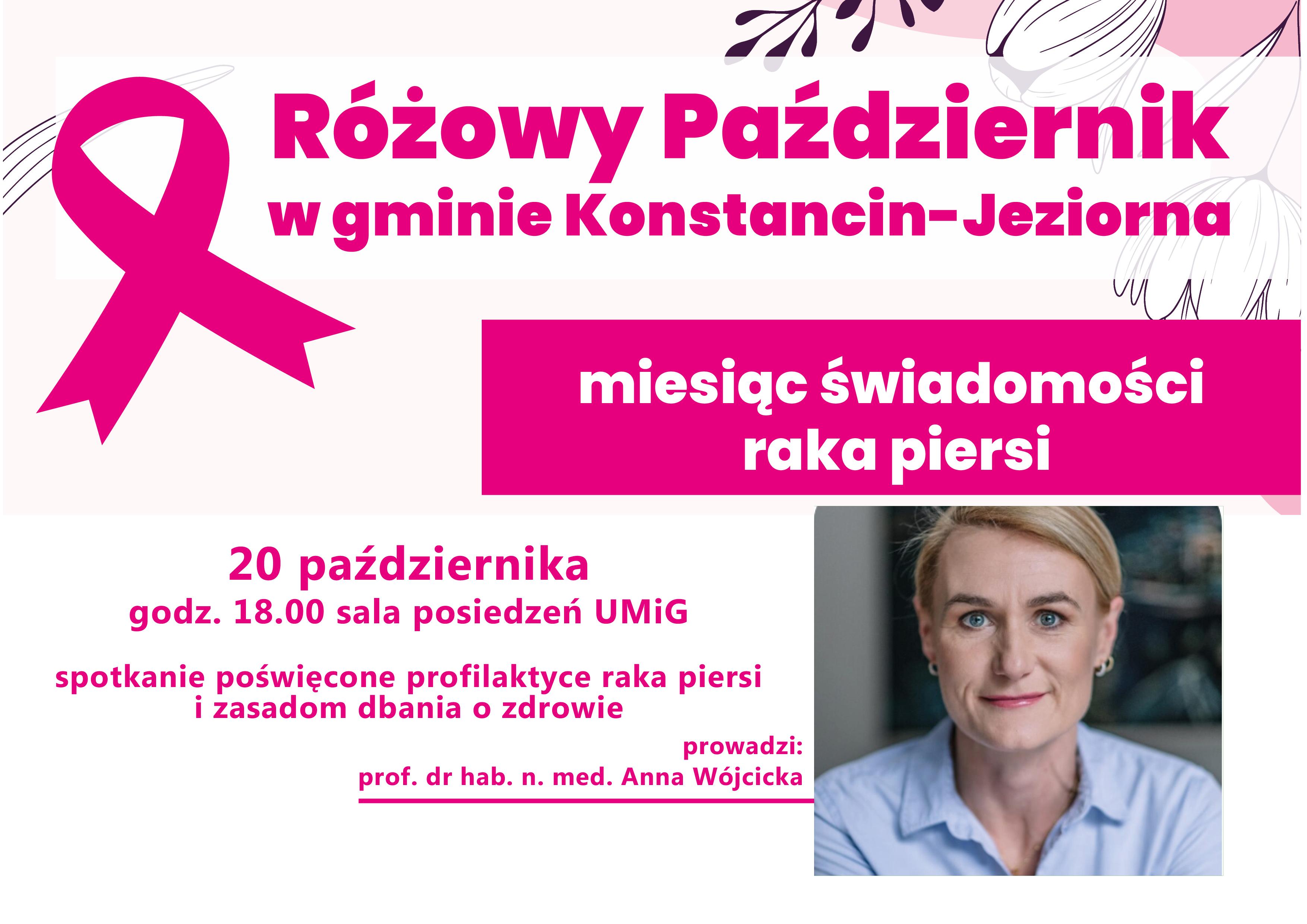 Przed nami kolejne wydarzenie w ramach akcji Różowy Październik w gminie Konstancin-Jeziorna. W najbliższy poniedziałek (20 października) o godz. 18.00 w Urzędzie Miasta i Gminy odbędzie się spotkanie ze specjalistką poświęcone profilaktyce raka piersi oraz zasadom dbania o zdrowie.