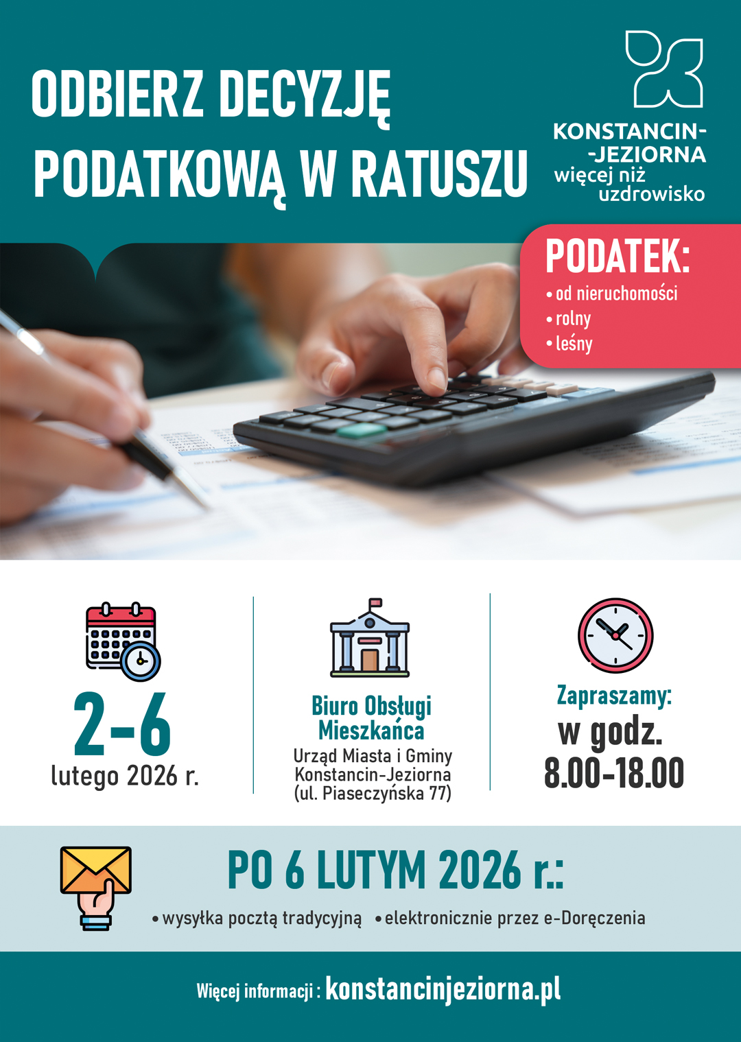 Już blisko 700 mieszkańców osobiście odebrało decyzje podatkowe na 2026 rok. Ci, którzy jeszcze tego nie zrobili, nadal mają taką możliwość – konstanciński magistrat wydłużył termin ich wydawania do 6 lutego. Po tym terminie decyzje zostaną doręczone pocztą.