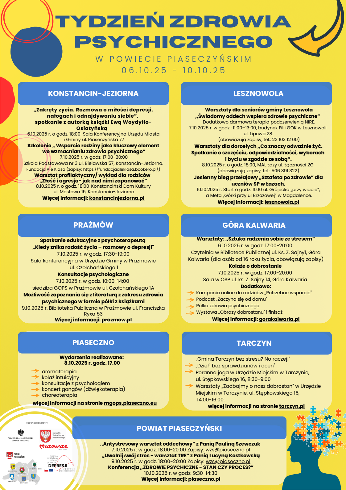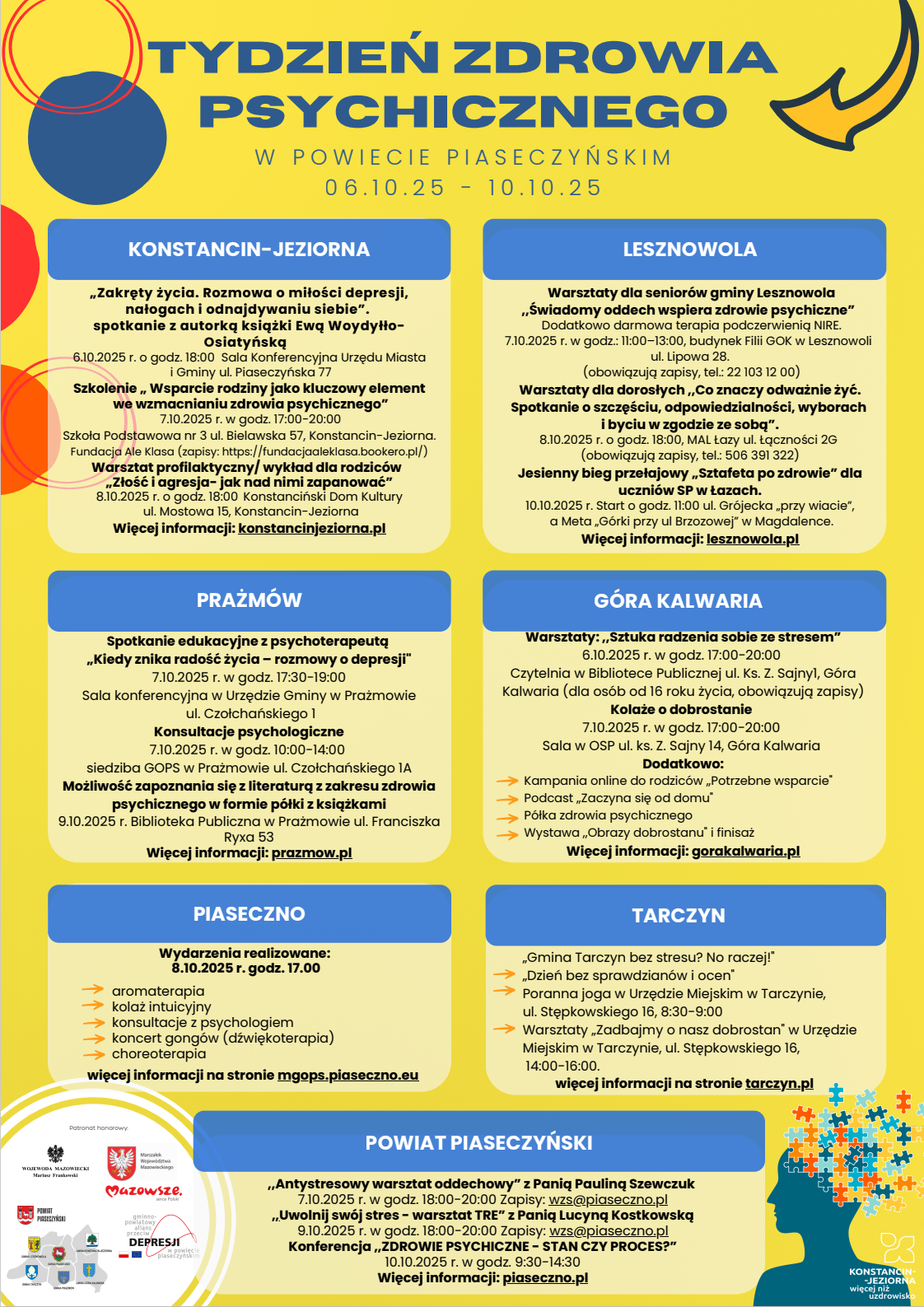 10 października obchodzimy Światowy Dzień Zdrowia Psychicznego. W dzisiejszych czasach jest to szczególnie ważny temat. Z tej okazji powiat piaseczyński przygotował cykl spotkań i warsztatów, które będą odbywać się w sześciu gminach, w tym także w gminie Konstancin-Jeziorna, przez cały kolejny tydzień (6 –10 października). Dzięki wsparciu specjalistów dowiemy się, jak radzić sobie w sytuacjach kryzysowych oraz jak wspomóc bliskich w trudnych chwilach. Honorowy patronat nad wydarzeniem objęli Wojewoda Mazowiecki i Marszałek Województwa Mazowieckiego.
